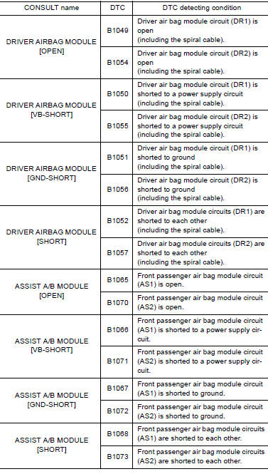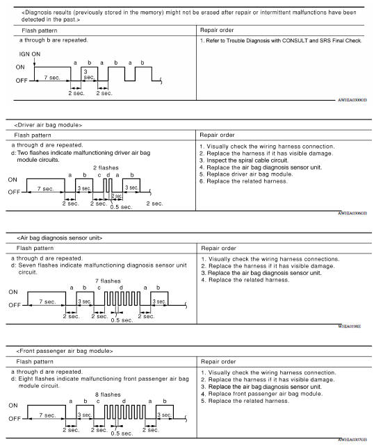 NOTE: Follow the procedures in numerical order when repairing malfunctioning parts. Confirm whether malfunction is eliminated using air bag warning lamp or CONSULT each time repair is finished. If malfunction is still observed, proceed to the next step. When malfunction is eliminated, further repair work is not required.