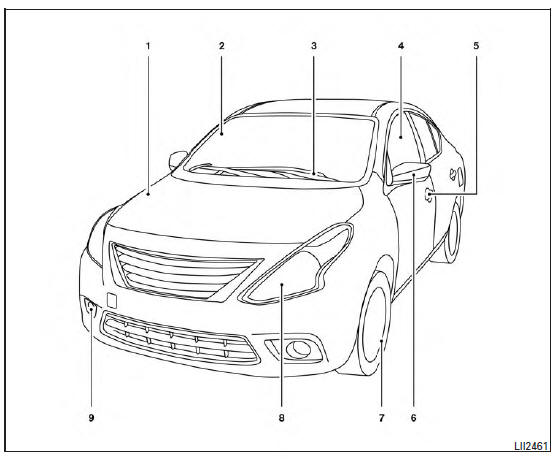 1. Antenna 2. Rear window defroster switch 3. Trunk lid release 4. Rearview camera (if so equipped) 5. Replacing bulbs 6. Fuel-filler door. Fuel-filler cap. Fuel recommendation 7. Child safe ...
